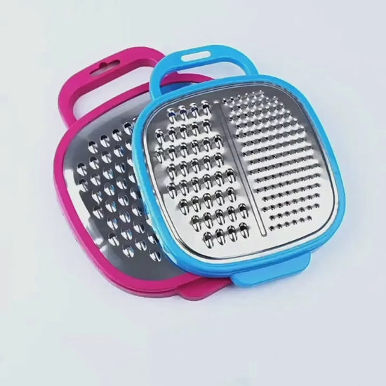 3-in-1 design for grating, slicing, and peelingIncludes storage container for convenienceThree blades for versatile useNon-stick coating for smooth operationSuitable for cheese, fruits, and vegetablesHelps save time in kitchen tasks